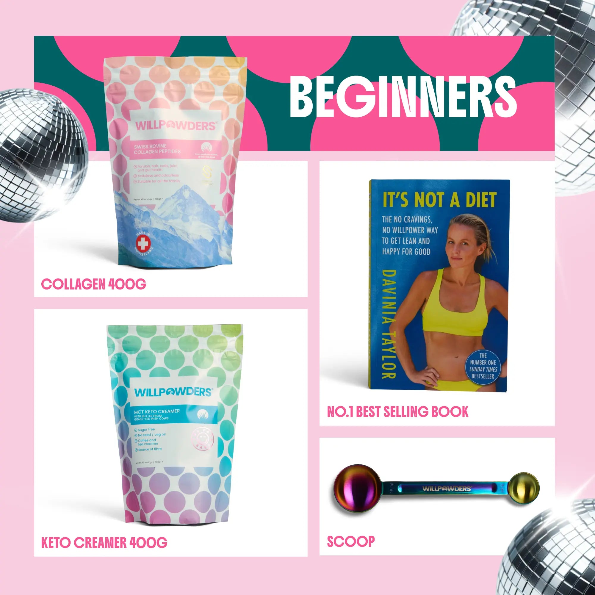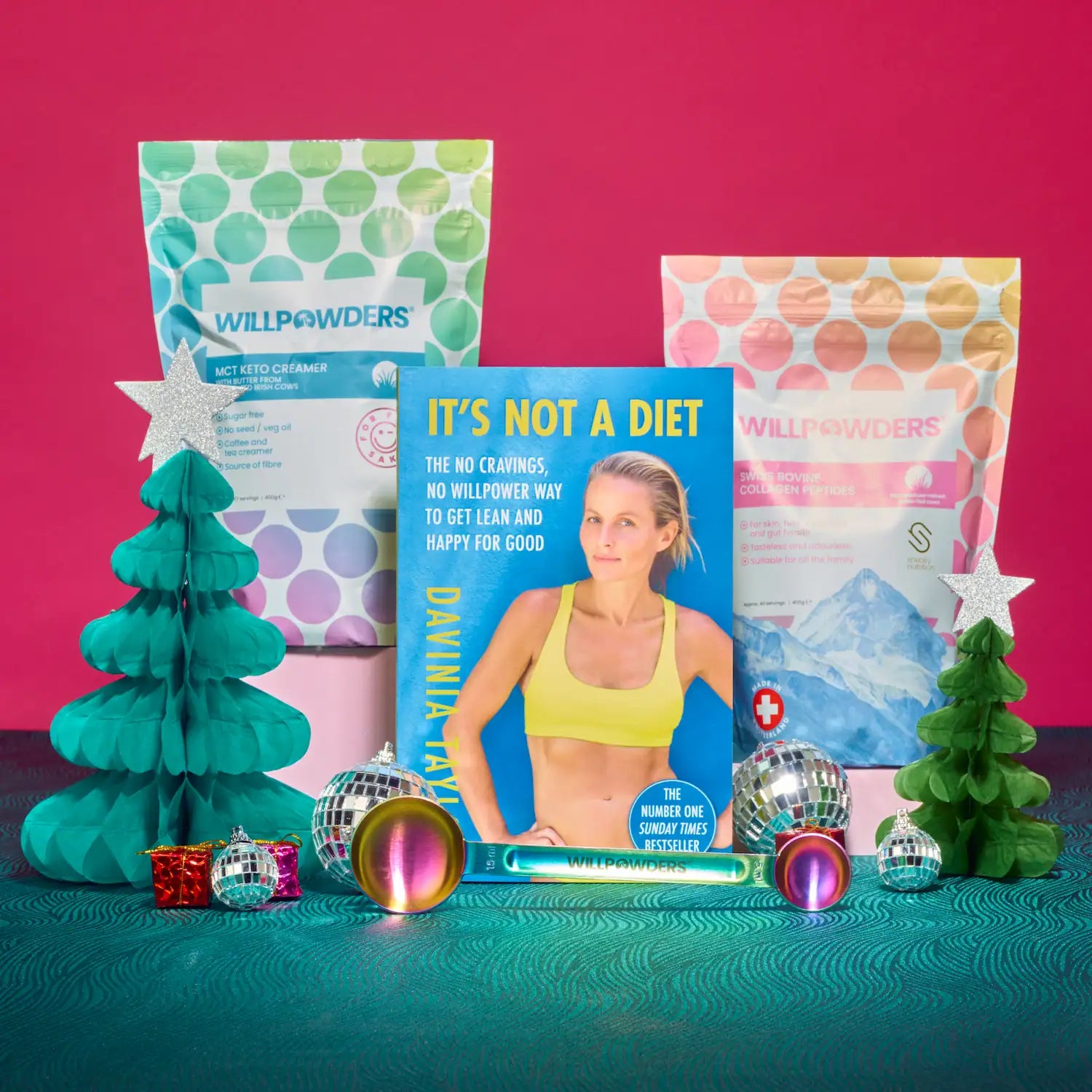 400g Bovine Collagen Powder, 400g MCT Keto Creamer, Davinia’s No.1 best-selling book It’s Not A Diet and a Scoop.