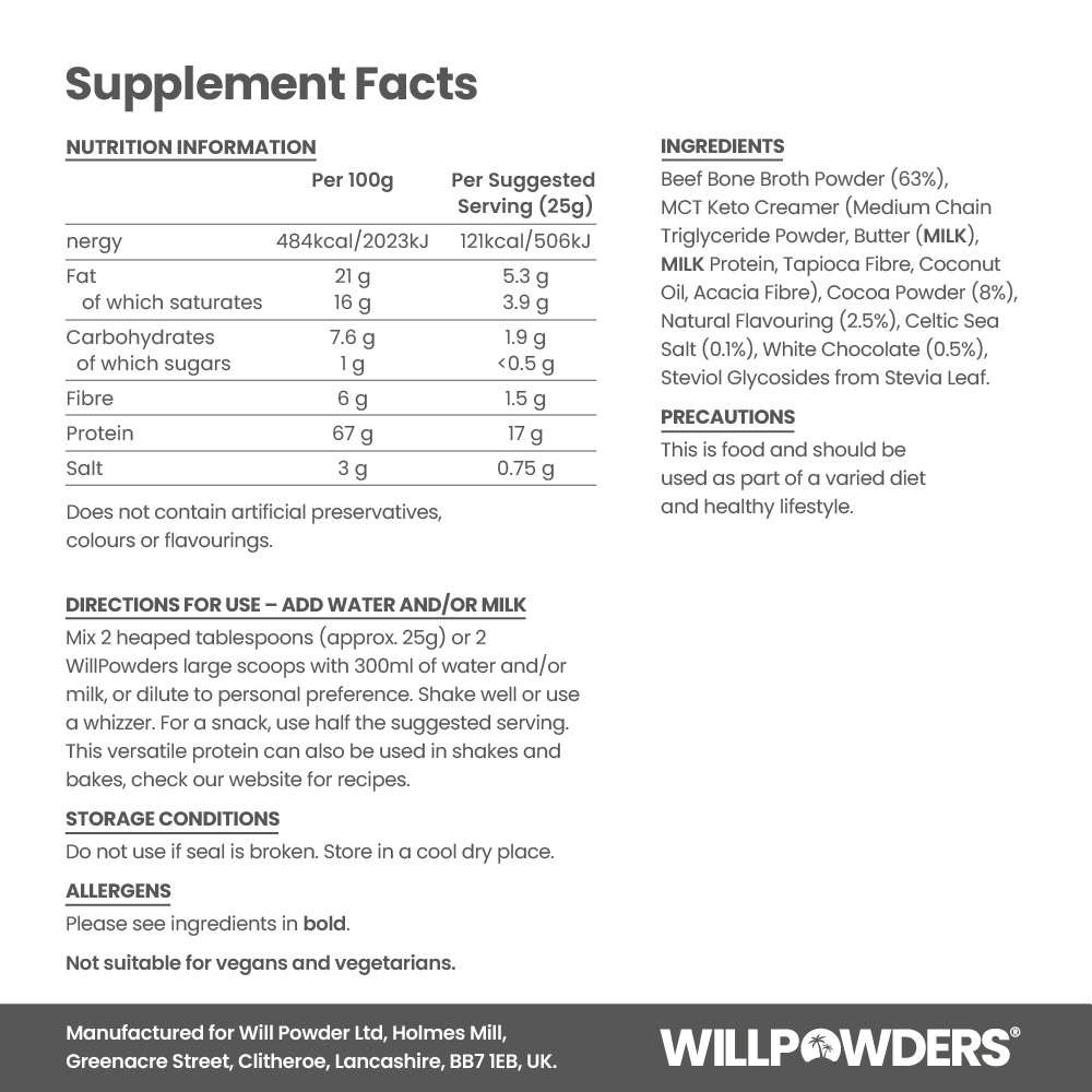 • Craving crushing – the only protein powder on the market to contain bone broth and MCT keto creamer
